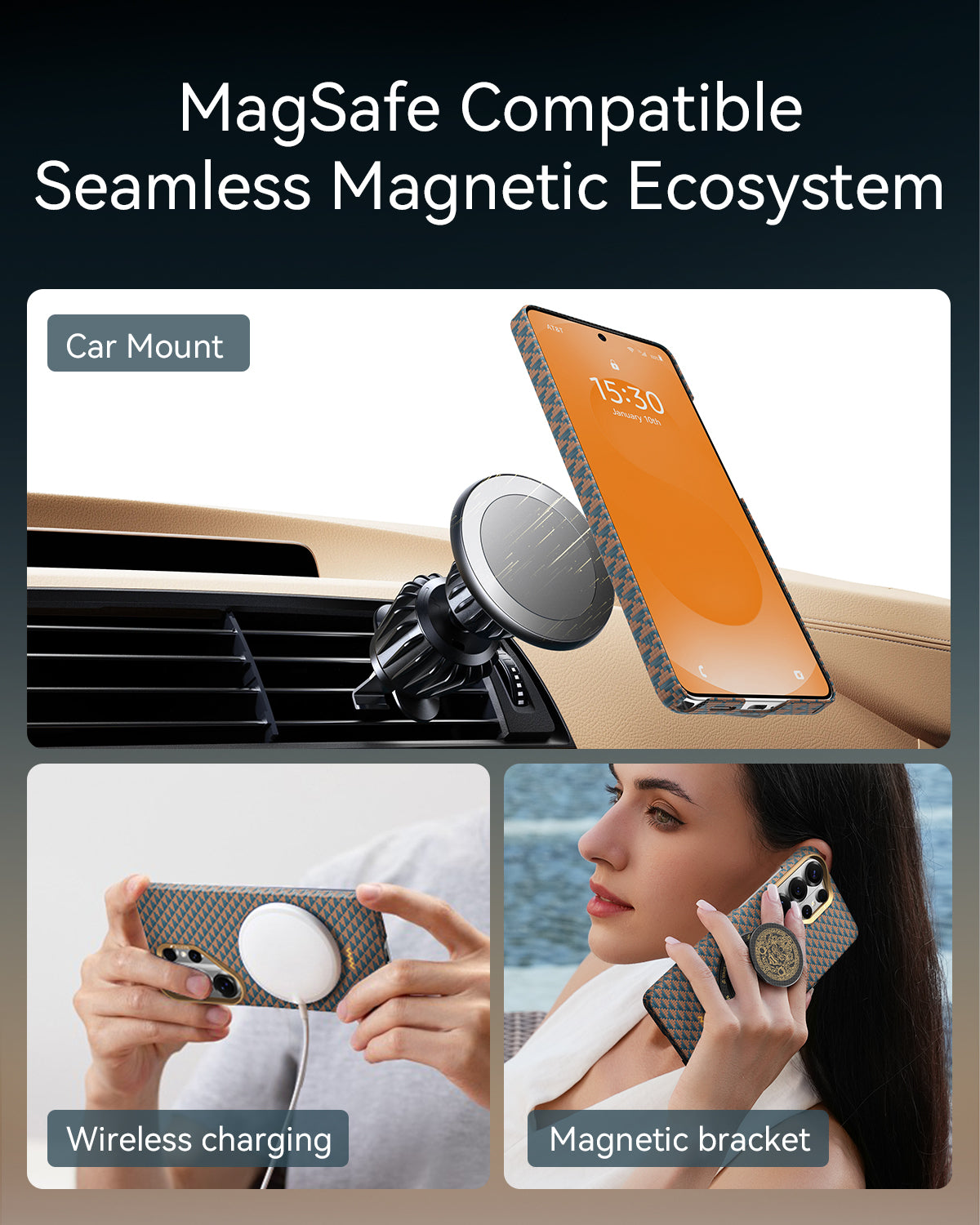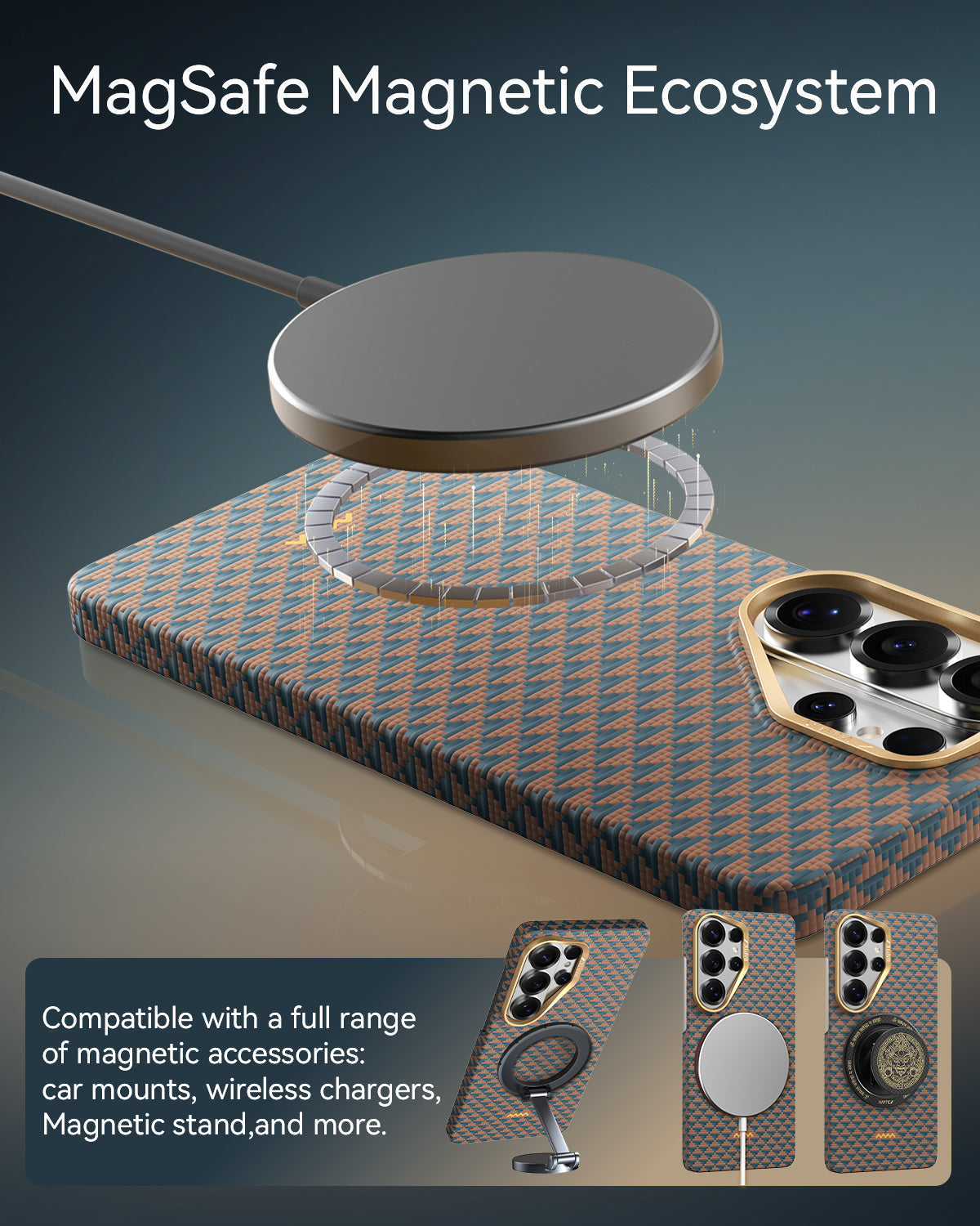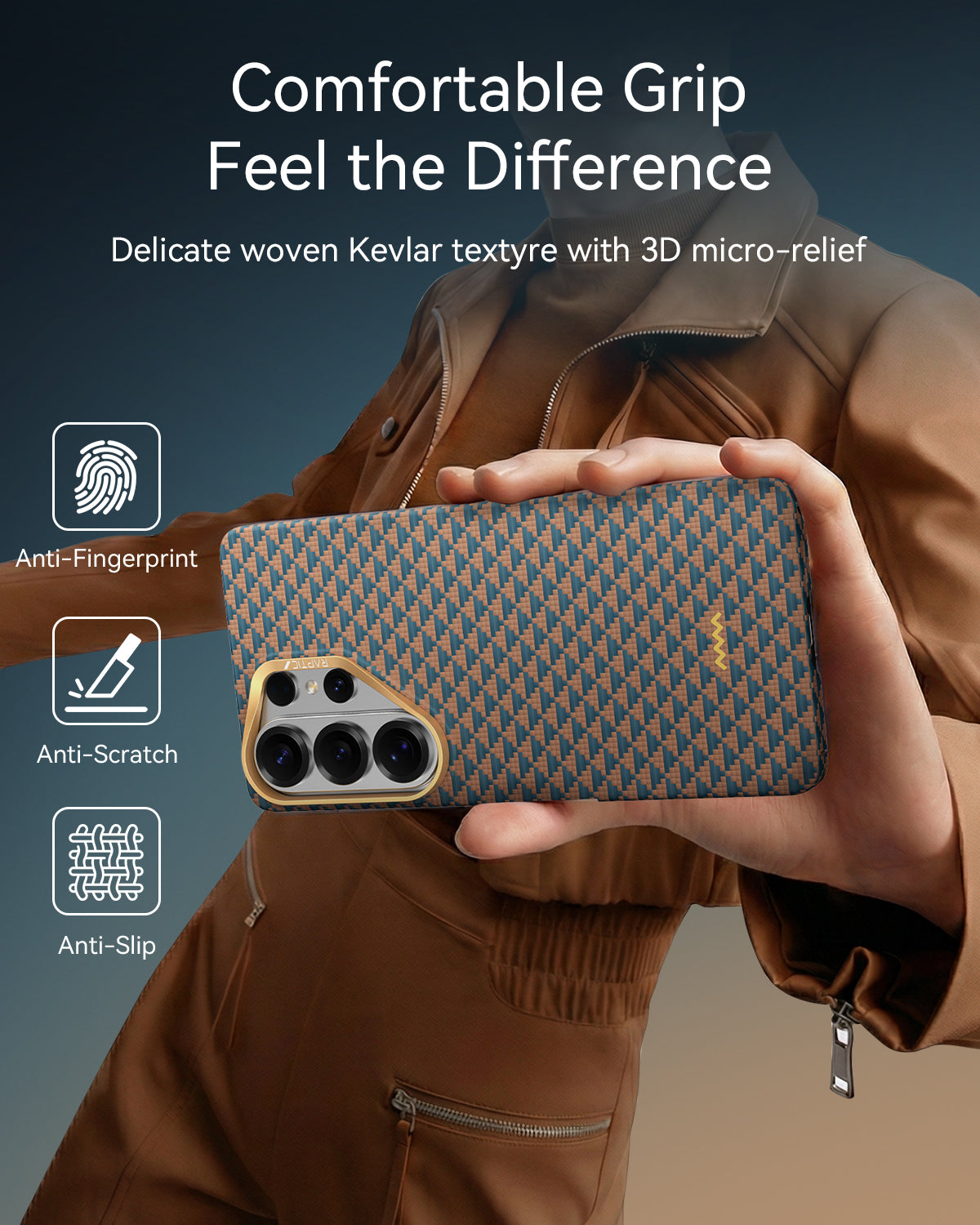 Woven from ultra-strong aramid fiber, the same material used in jets and military gear, this Phone case delivers unbeatable scratch resistance, ultra-lightweight comfort, and discoloration. Unlike carbon fiber, it’s non-conductive and won’t interfere with the signal.