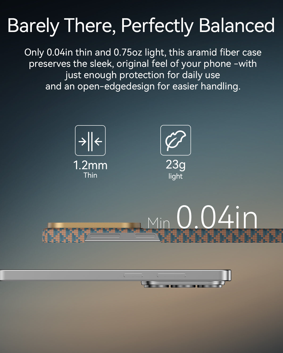 Only 0.04in thin and 0.65oz light, this aramid fiber case preserves the sleek, original feel of your phone — with justenoughprotectionfordaily use.