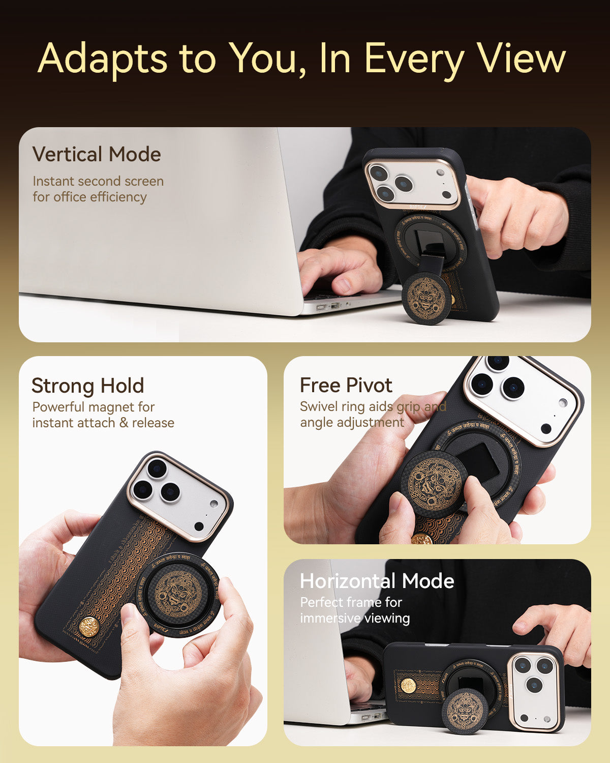 In a snap, add a grip or tripod for your phone, this MagSafe compatible ring stand connects to your MagSafe case or phone. Conveniently designed to instantly switch out your MagSafe accessories. Made with super strong magnets, selfies and movie watching just got a whole lot easier with the 360º swivel, allowing you to do more.