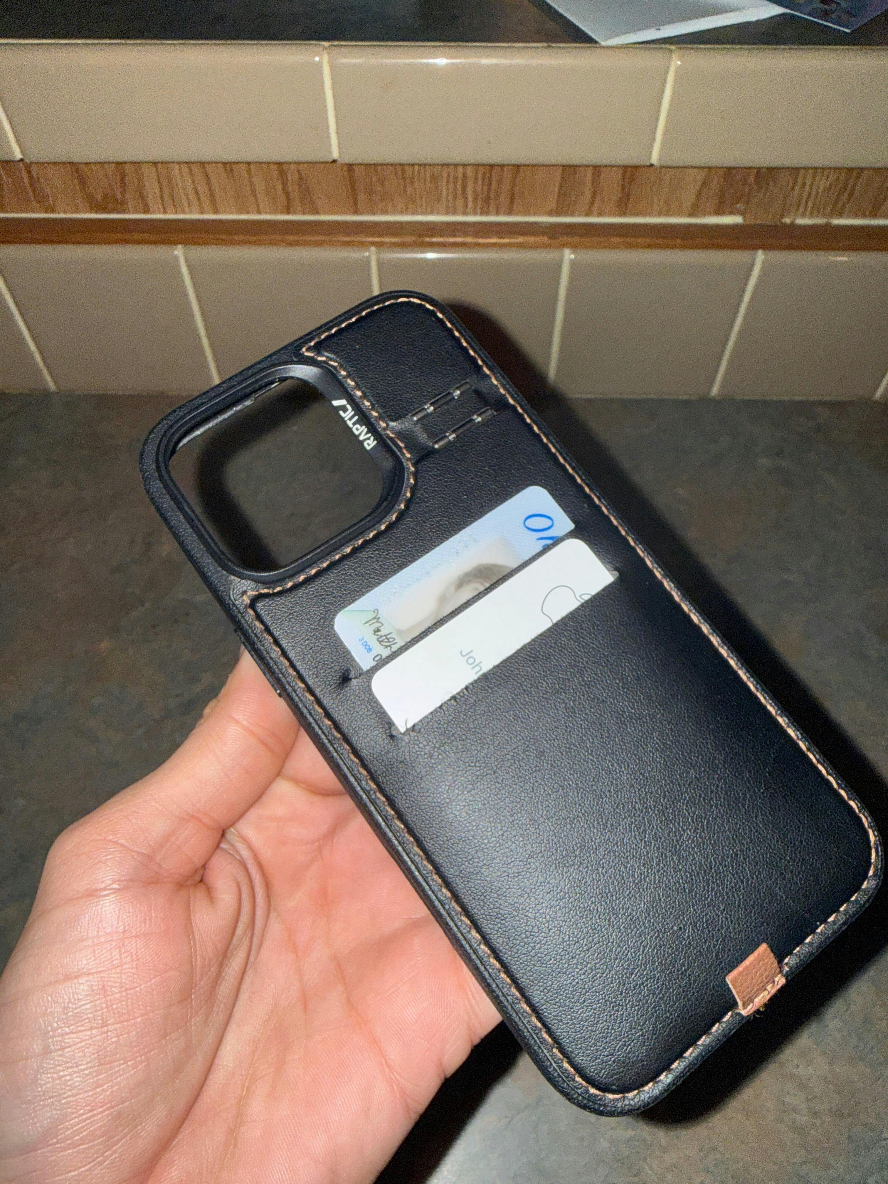I purchased this wallet case before my trip to Disney world and this turned out to be incredible helpful. I needed a wallet case that was MagSafe and this one was a unique way to solve the MagSafe issue with the flip up hinge. I absolutely love the stitching and they made it not slippery in the hand. Only issue is if you have a heavier card (like the Apple credit card) if you drop your phone it may fall out. But other than that great case!!